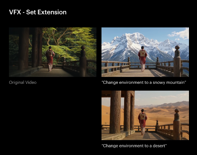 Virtual Set Extensions & Redesign: Expand your scene beyond the original footage. Want to turn a modest living room into a futuristic control center? Just describe it, and let the AI handle the heavy lifting.